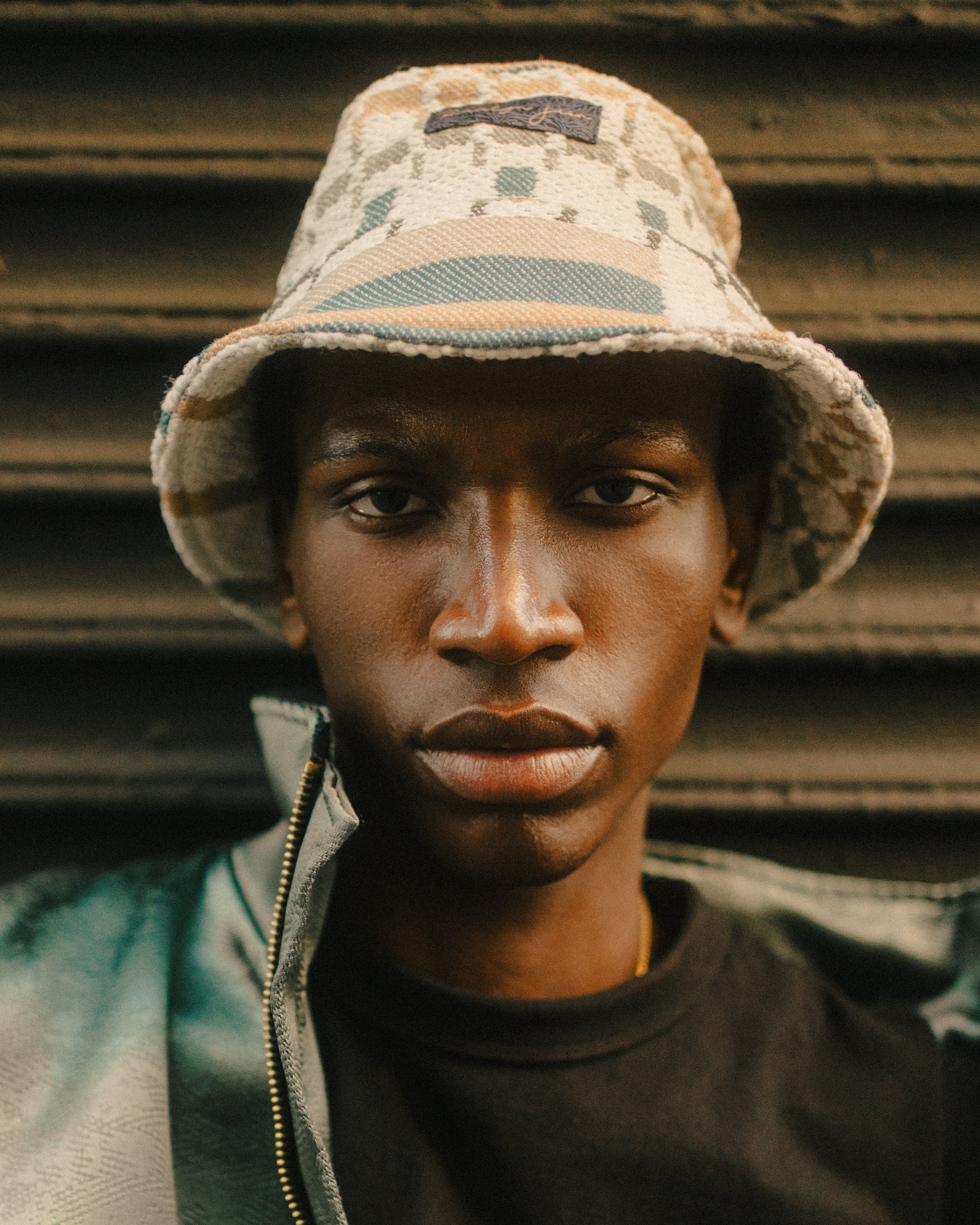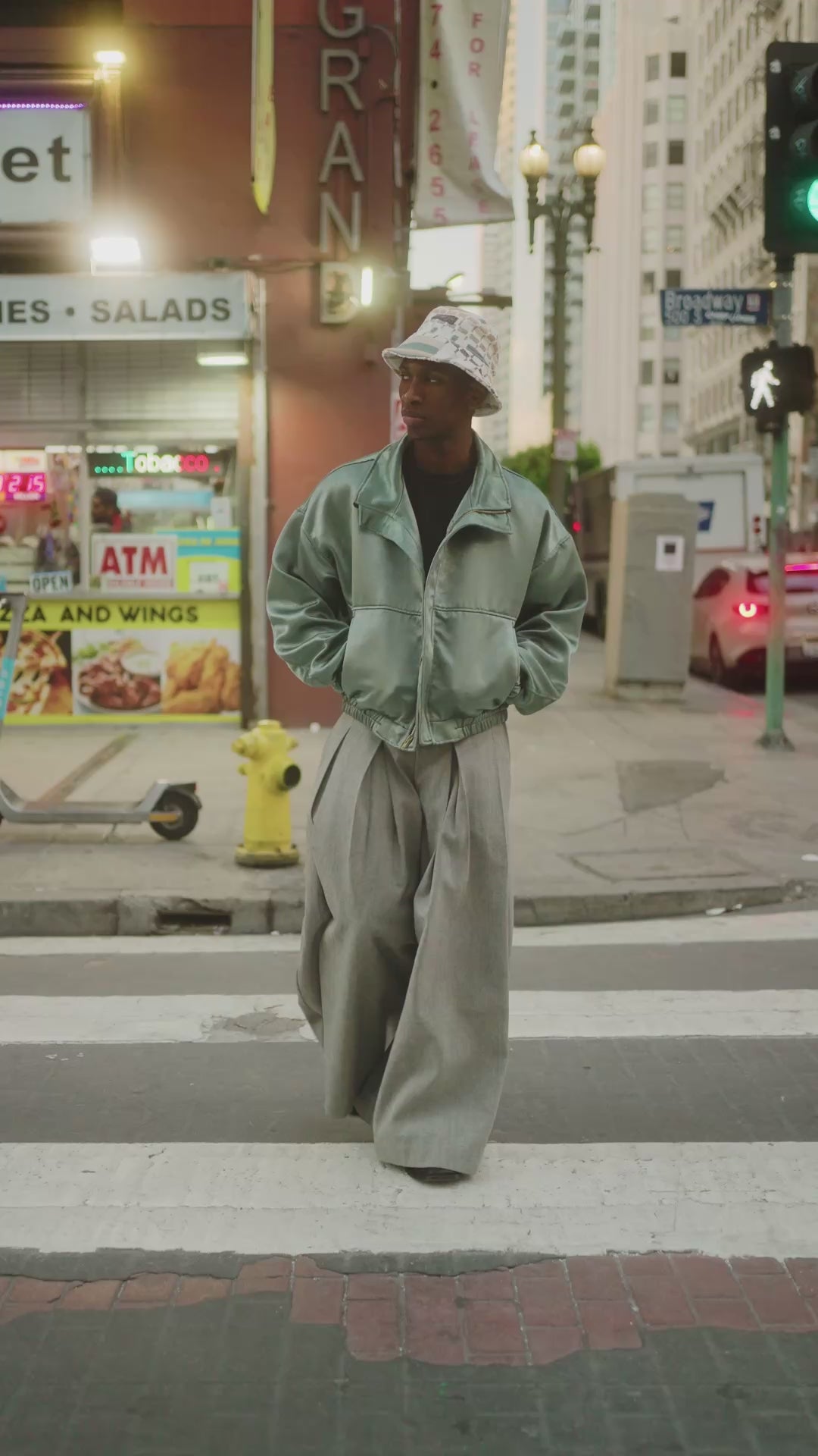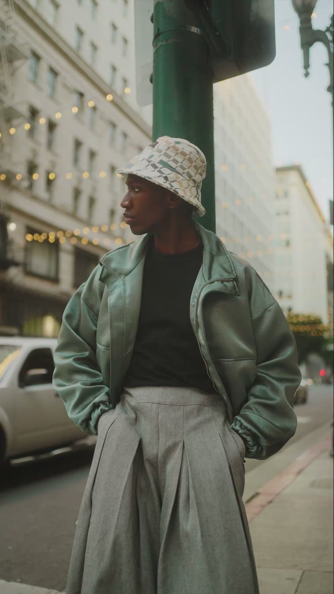 DAVID IS WEARING THE ZOE BUCKET HAT - ZANE BOMBER JACKET - KHADIJAH WIDE LEG PANTS